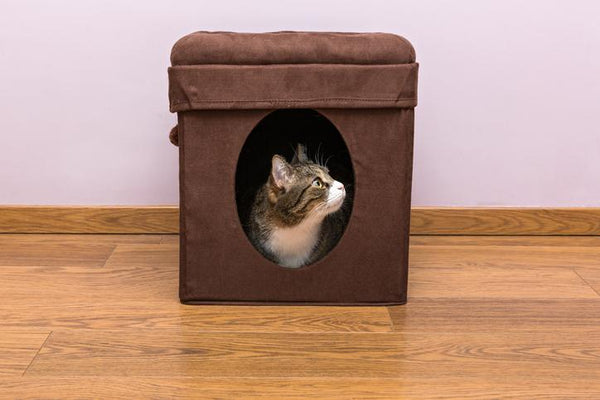 Escondites. A los gatos les gusta esconderse cuando se sienten asustados o estresados, así que asegúrate de que haya muchas opciones alrededor de la casa para ellos. Las cajas de cartón son ideales para hacer fuertes caseros y son fáciles de trasladar a diferentes zonas de la casa. A los gatos también les gusta posarse en lo alto para observar su entorno, ya que les ayuda a sentirse seguros. Por eso apreciarán el acceso a estantes altos. o trepar a los árboles y poner una cama en lo alto para ellos si es posible. Solo asegúrese de que puedan subir y bajar de forma segura y sencilla. para evitar posibles lesiones.