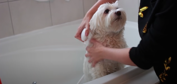 首先我们要给小熊洗澡,在剪毛之前确保你的狗完全干净。 我们建议在这里使用一个挂在浴缸顶部的淋浴附件,它有一个小软管。检查水并确保水温不冷,然后我们会抓住他并把他扔进浴缸。我们的熊现在是一个很好的男孩,他喜欢站在壁架上,我们把他弄湿,并确保水覆盖他所有的皮毛,他的皮毛非常厚。重要的是要确保所有东西都浸湿,但是然后你只需要用洗发水并将其擦在他身上,让他全身都起泡沫,完成后确保你把它冲洗干净,我们喜欢就这样把他的胳膊和腿或者积水最多的地方用橡皮扫帚清理掉。