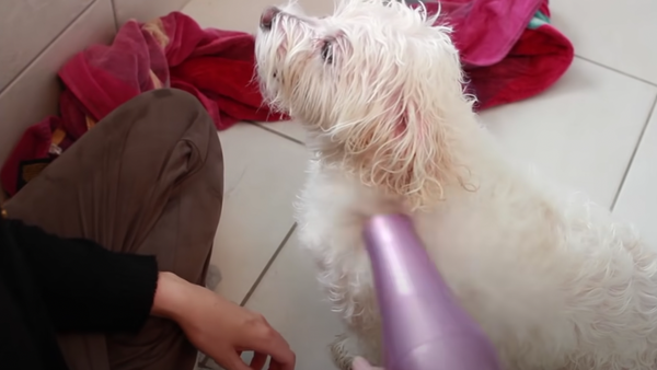 然后我们可以把他抱起来,用毛巾把他包起来,然后我们用毛巾很快地把它们擦干,然后他下一个不太喜欢的部分是吹干。我们只是抓起吹风机,将其设置为从冷到暖的温度,你不想烫伤他。 你只需要把整个东西吹干,然后这是他洗完澡后的小例行公事,他喜欢在地毯上擦干脸。