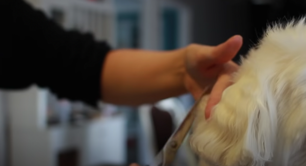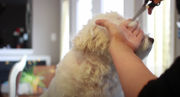 完成所有修剪后,我们从头部开始,这部分实际上只是用剪刀,我们在这里所做的只是将头发向前刷到眼睛上方,然后用直剪一直穿过剪刀。只要稍微清理一下,我们就可以去掉他眼睛里的脏东西。确保他眼睛周围的所有毛发都没有粘到眼睛里,然后拿起稀疏的剪刀和梳子