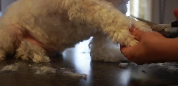 然后我们继续修剪他的腿和脚,修剪脚周围的毛发,使其看起来更漂亮,看起来更圆,而不是所有松软的费用。用剪刀修剪所有这些,并剪掉所有较长的部分。抓住他的脚,修剪脚垫周围的毛发。小心地剪掉脚趾之间和脚垫周围的所有毛皮。